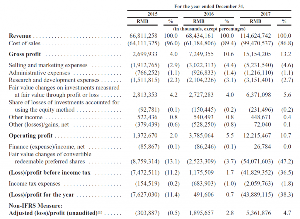 The prospectus disclosed that Xiaomi’s revenues from 2015 to 2017 were 66.811 billion yuan ($10.49 billion), 68.34 billion yuan ($10.73 billion) and 114.625 billion yuan ($18 billion) respectively. It experienced an year-on-year increase of 67.5% in 2017. Its operating profitS from 2015 to 2017 were 1.373 billion yuan ($215.6 million), 3.785 billion yuan ($594.4 million) and 12.215 billion yuan (1.918 billion). The year-on-year increase in 2017 was 222.7%.
