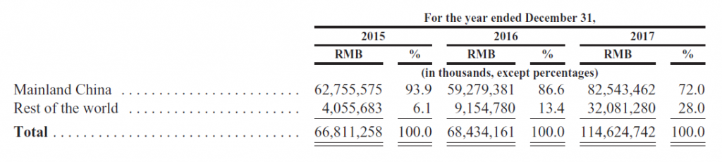 According to the prospectus, in terms of the revenue from mainland China versus the rest of the world, 93.9%, 86.6% and 72.0% were the percentages of total revenues from mainland China in 2015, 2016 and 2017.