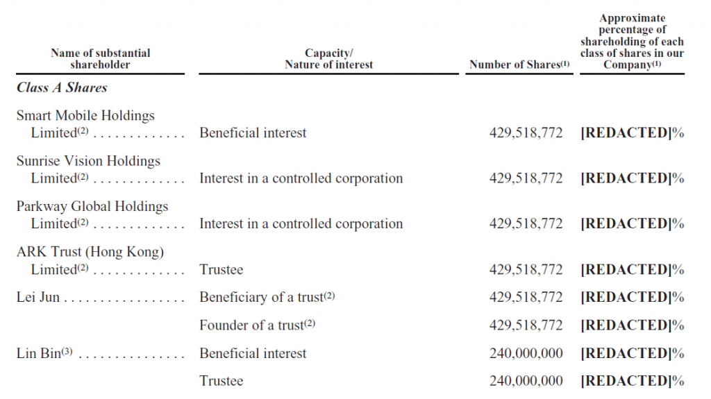 According to SEHK’s new policy, Xiaomi’s chairman Lei Jun and Xiaomi’s president Lin Bin own Class A shares with super voting rights. Compared with common stocks, a holder of a Class A Share is entitled to ten votes per share.